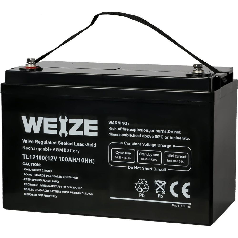 The WEIZE 12V 100Ah deep cycle AGM battery is the perfect choice for power storage. It features an absorbent glass mat (AGM) that helps prevent acid leakage and frequent maintenance needs.