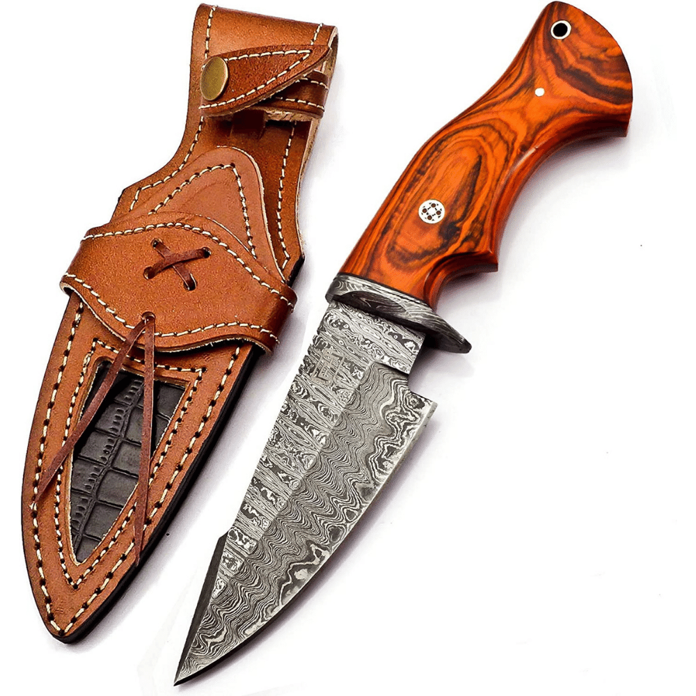 The FH KNIVES 10-inch steel knife handle is made from orange wood, giving it a unique look. The blade is made from forged Damascus steel, which looks attractive and makes the knife more durable than others in its category.