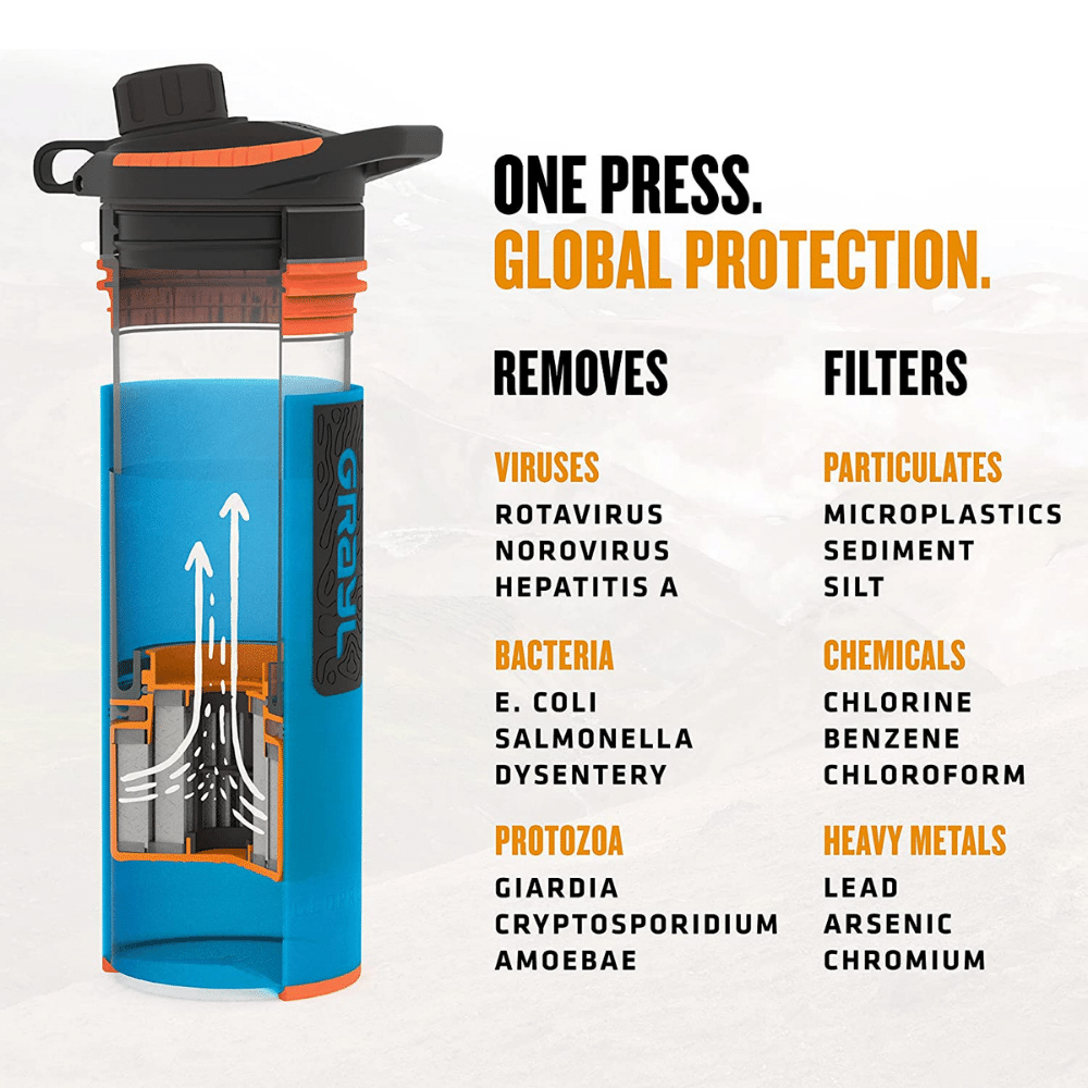 This incredible filtering water bottle removes all pathogens from contaminated water, including viruses, bacteria, and protozoa. It also uses an excellent water bottle filter for removing heavy metals.