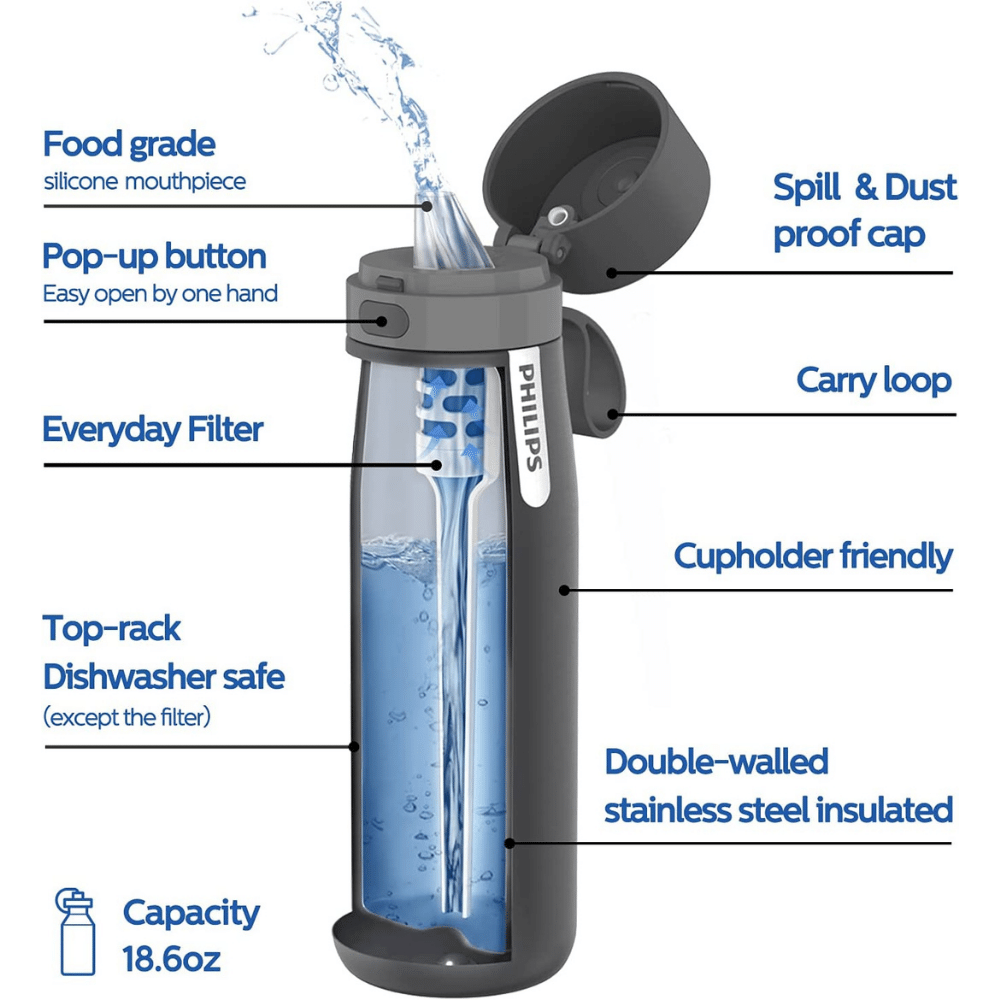 The Philips Water GoZero Everyday Insulated Water Bottle is a great way to keep your water clean and safe to drink. The activated carbon fiber filter instantly removes tap water contaminants and transforms it into cleaner, tastier & healthy drinking water.