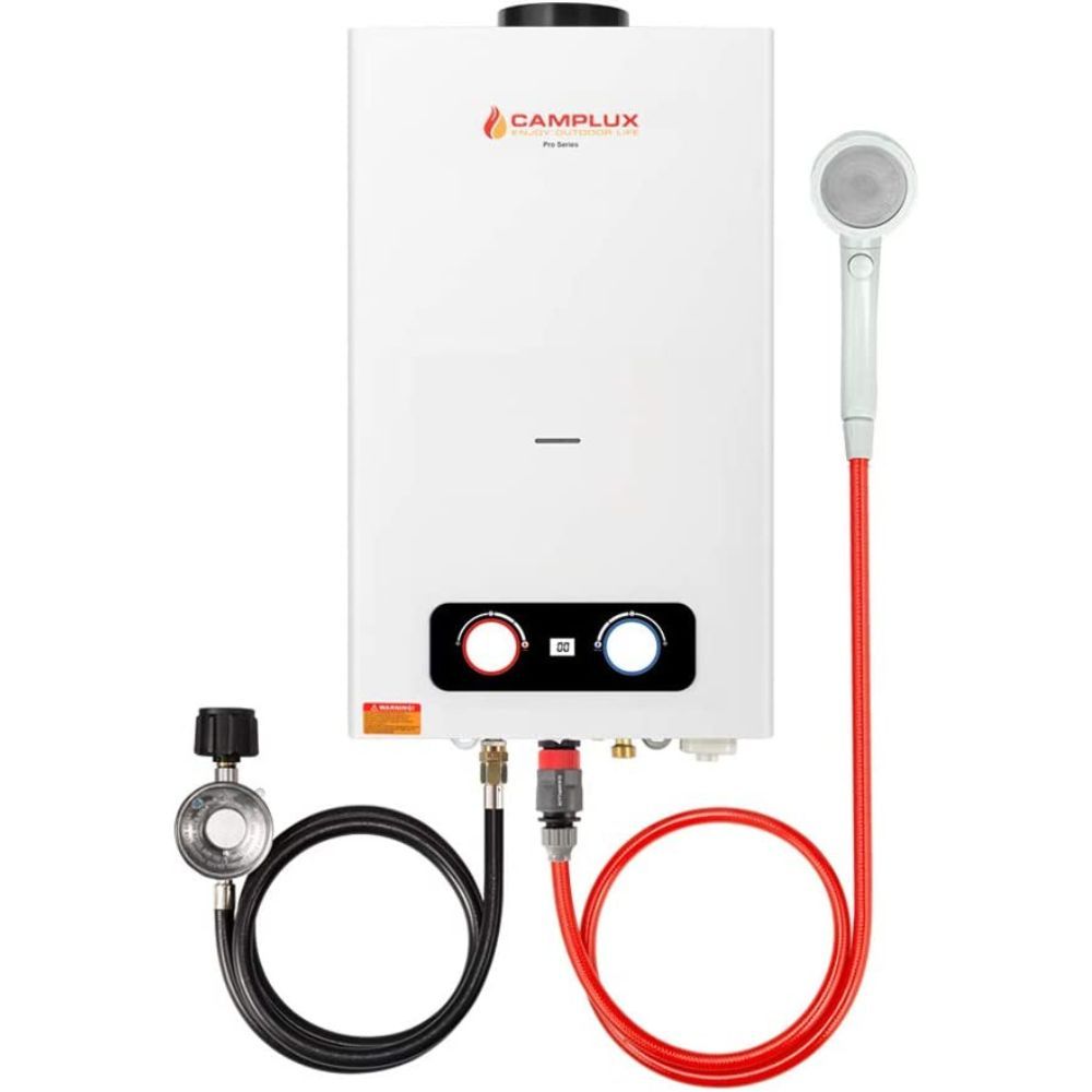 "This tankless water heater, then Camplux tankless propane heater, is an excellent option. Not only does it make hot water quickly and reliably, but it also runs on just two D batteries, propane, and proper water pressure. This means no more worrying about having an external power source for your hot water needs.