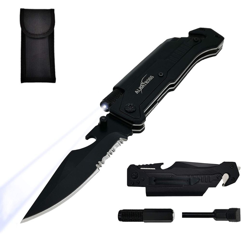 The Albatross tactical best survival pocket knife is perfect for a variety of uses. With five functions in one, it's the perfect tool for any situation. You can use the folding knife, LED light, seatbelt cutter, glass breaker, and magnesium fire starter with one easy-to-carry device.