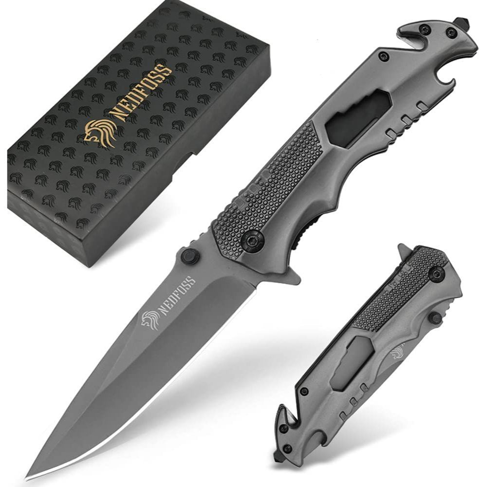 The NedFoss pocket knife for men is a multi-functional pocket knife offering users five tools in one convenient package. Its large blade is ideal for cutting, while its seatbelt cutter and glass breaker are perfect for emergency accident situations. It also features a bottle opener and four-size wrench so you can be prepared for any situation.